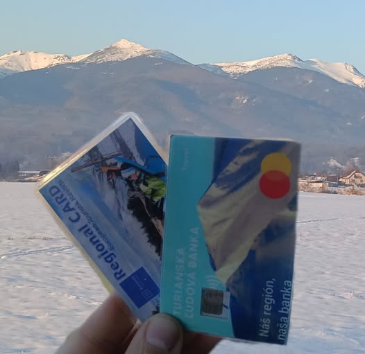Vízia karty výhod Regional CARD a platobnej karty Turianskej ľudovej banky. V pozadí vízia kabinkovej lanovky Trusalová Chleb.